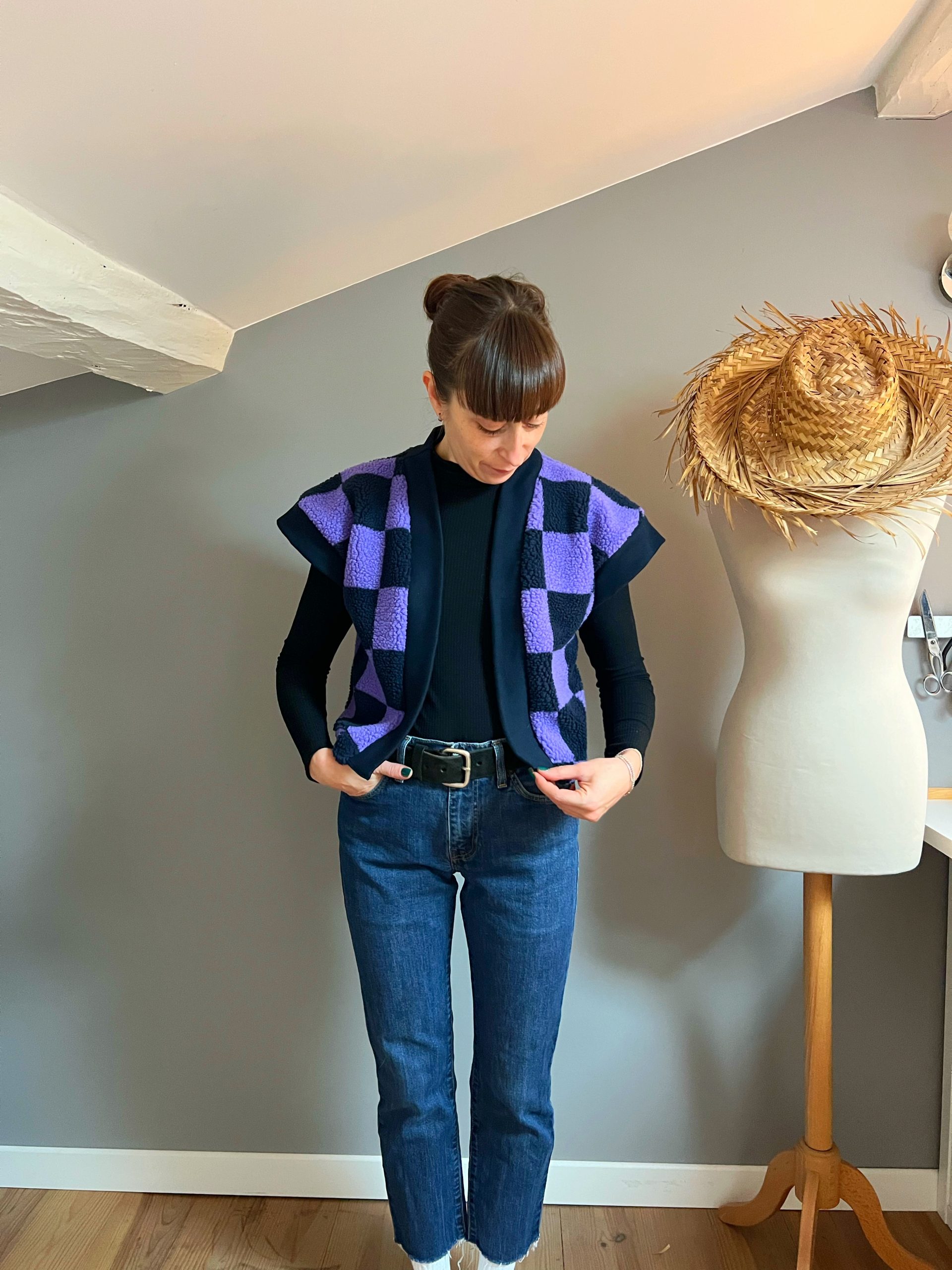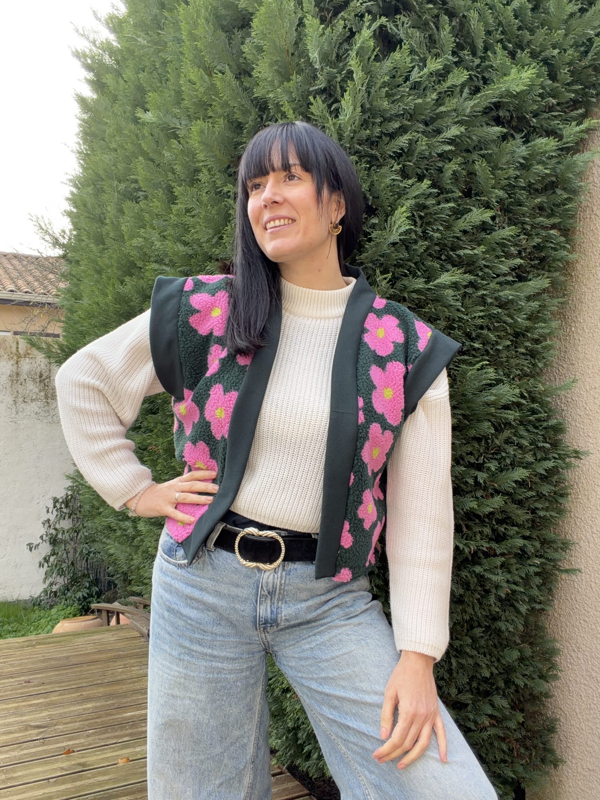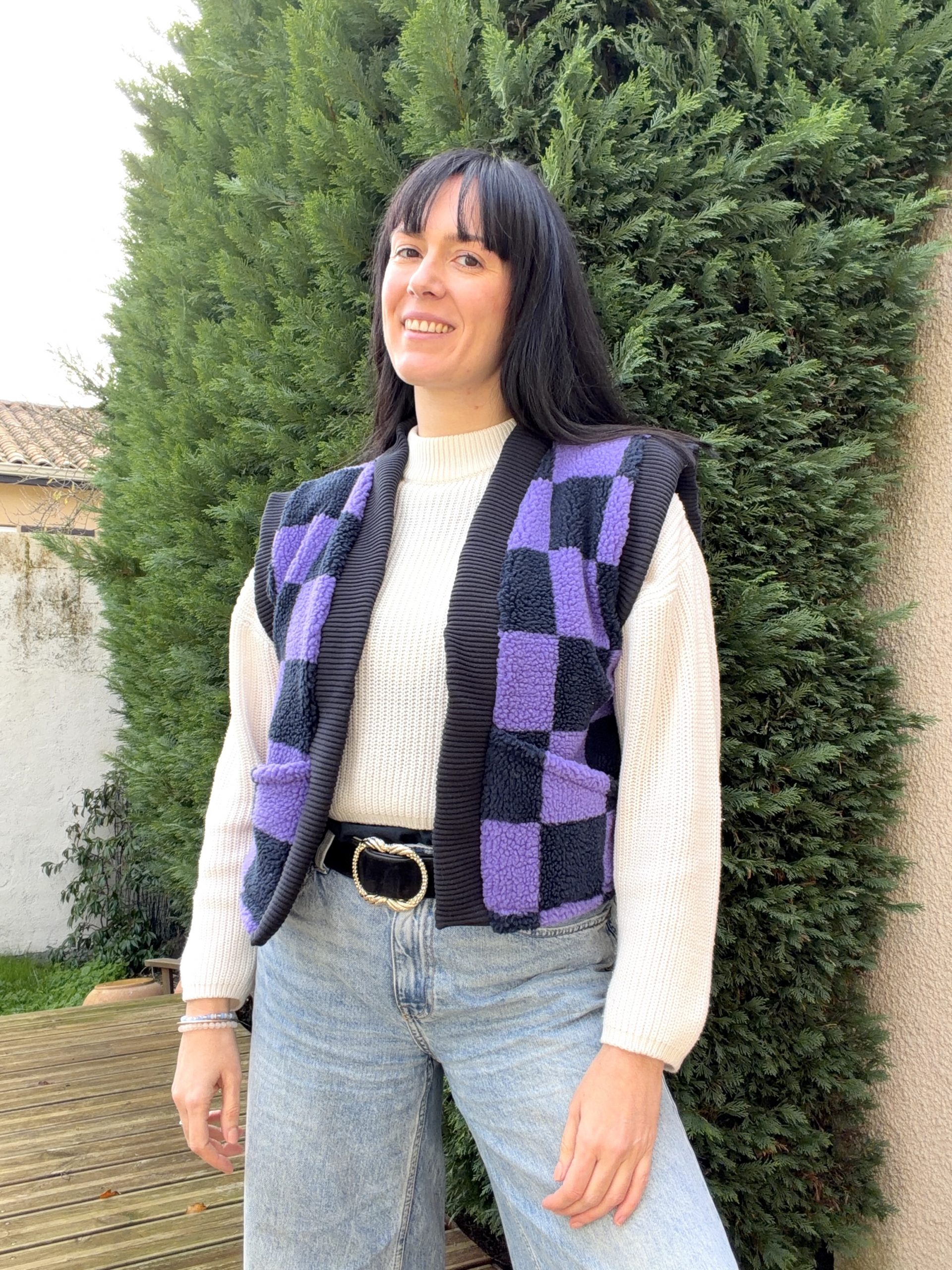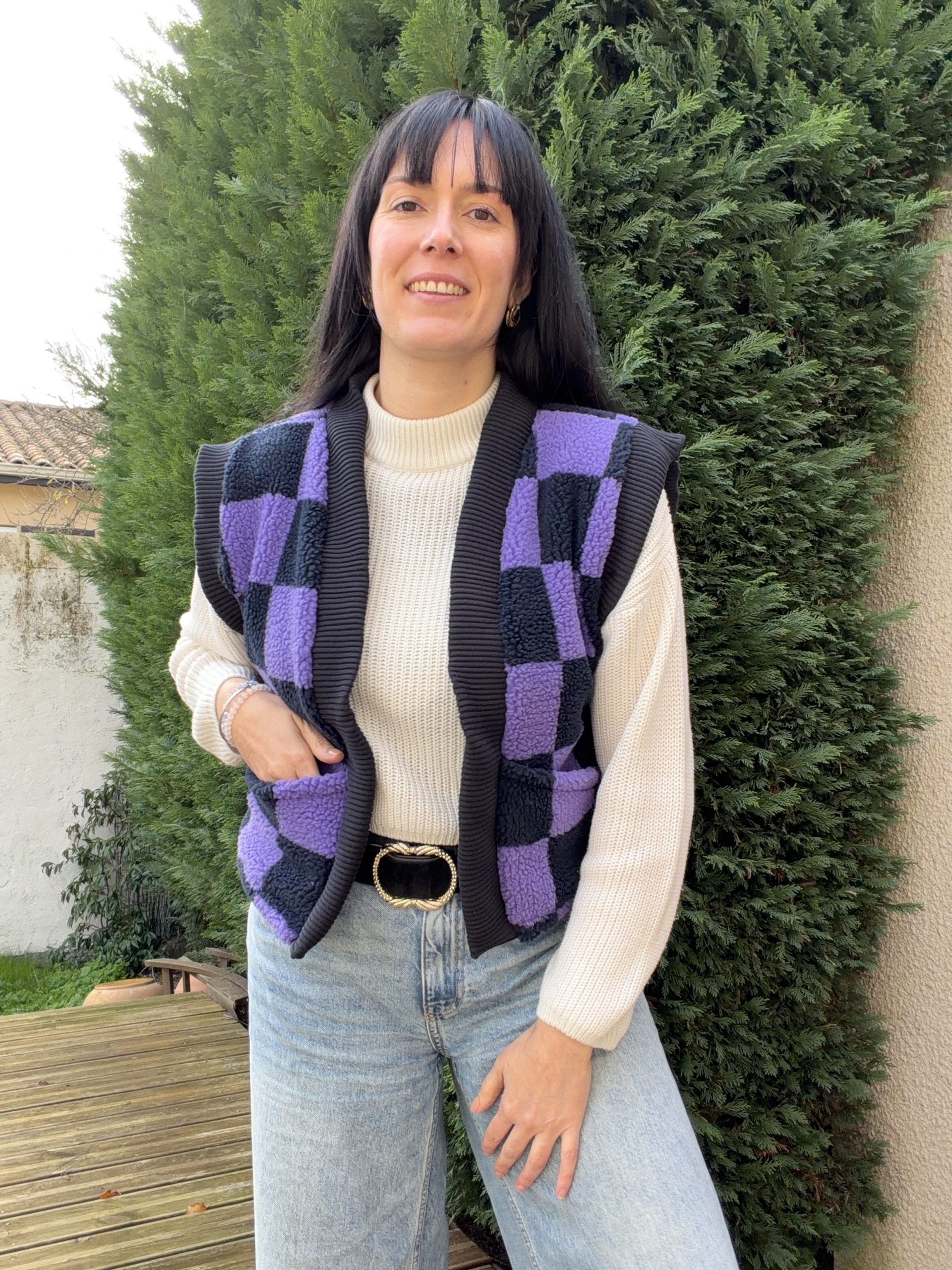 Le modèle présente une longueur au niveau des hanches, avec une col en bord-côte contrastant sur le devant, des emmanchures larges pour un effet fluide (idéal à porter avec une blouse bohème comme le patron Debra) pour s’adapter en toute saison !