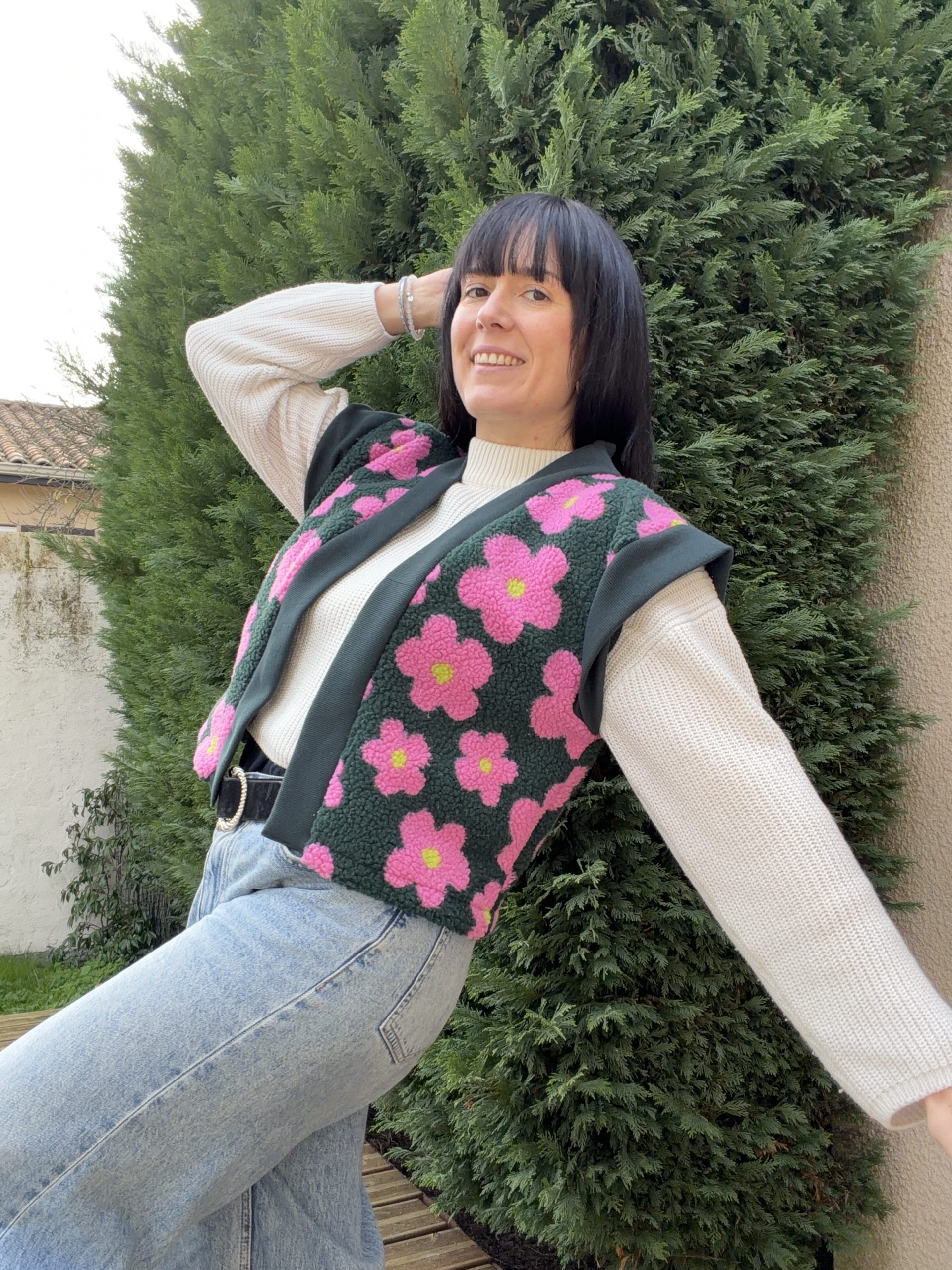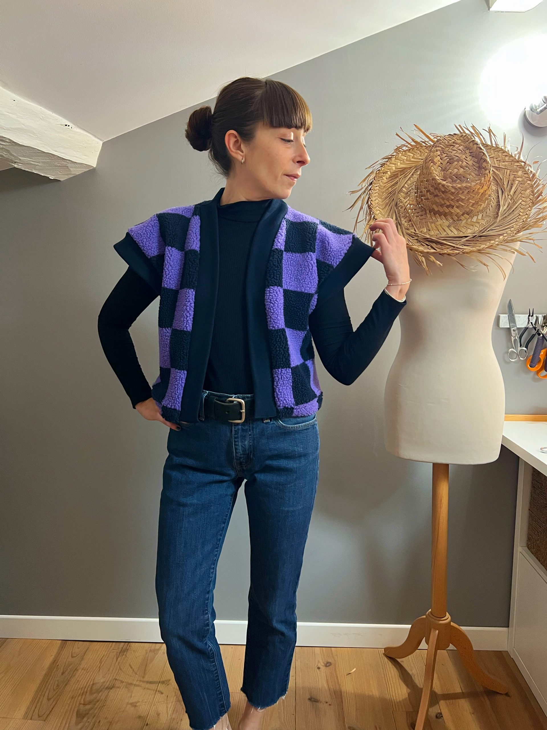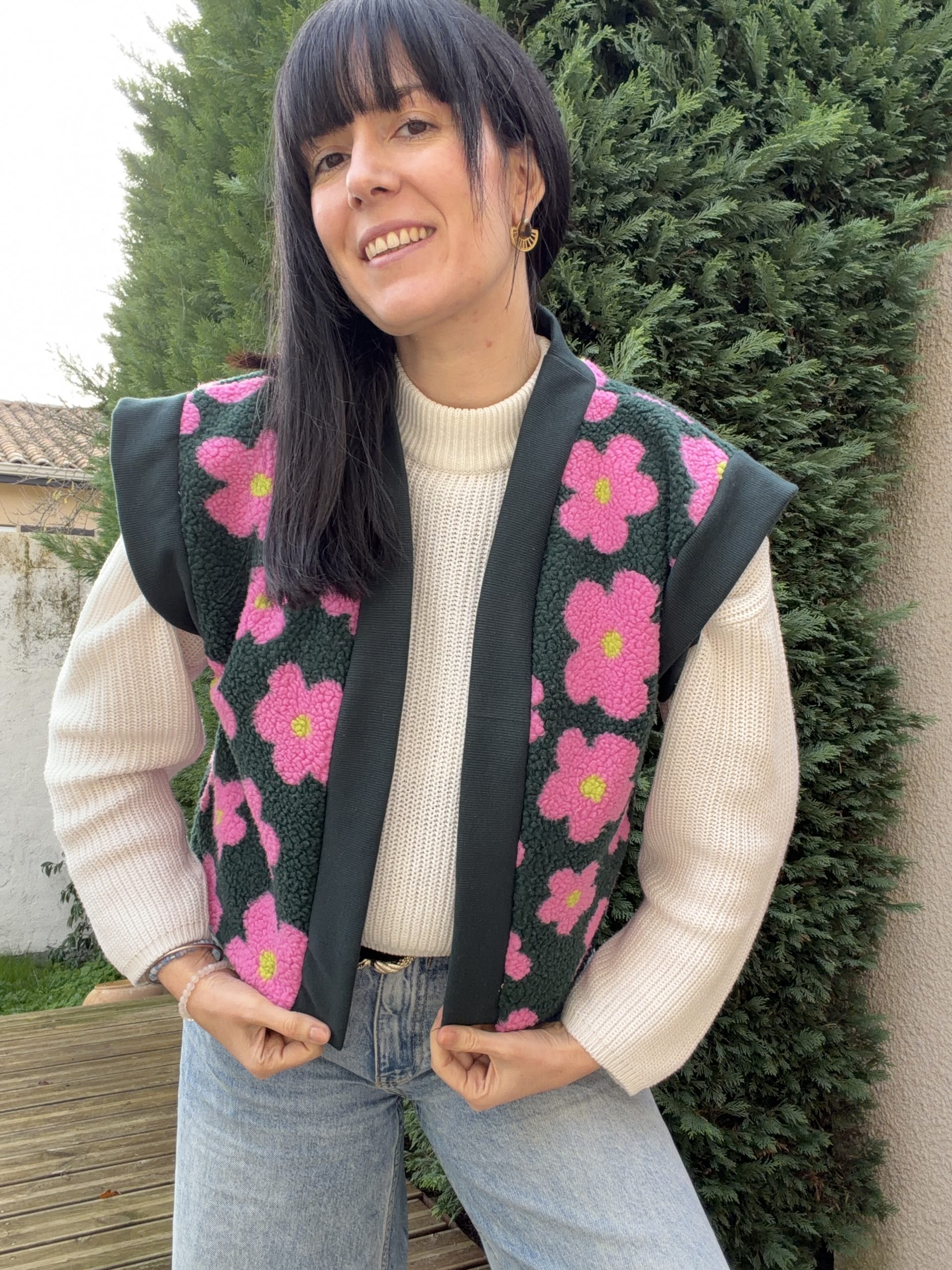 Le modèle présente une longueur au niveau des hanches, avec une col en bord-côte contrastant sur le devant, des emmanchures larges pour un effet fluide (idéal à porter avec une blouse bohème comme le patron Debra) pour s’adapter en toute saison !