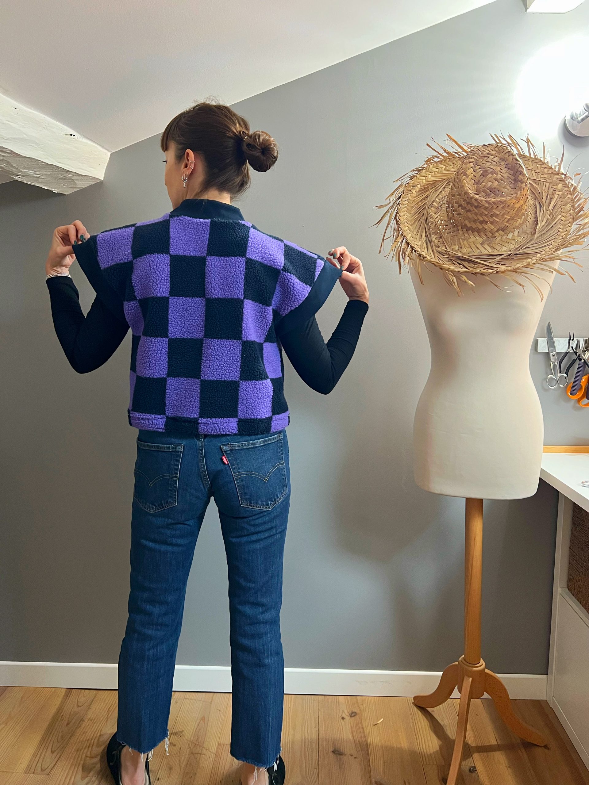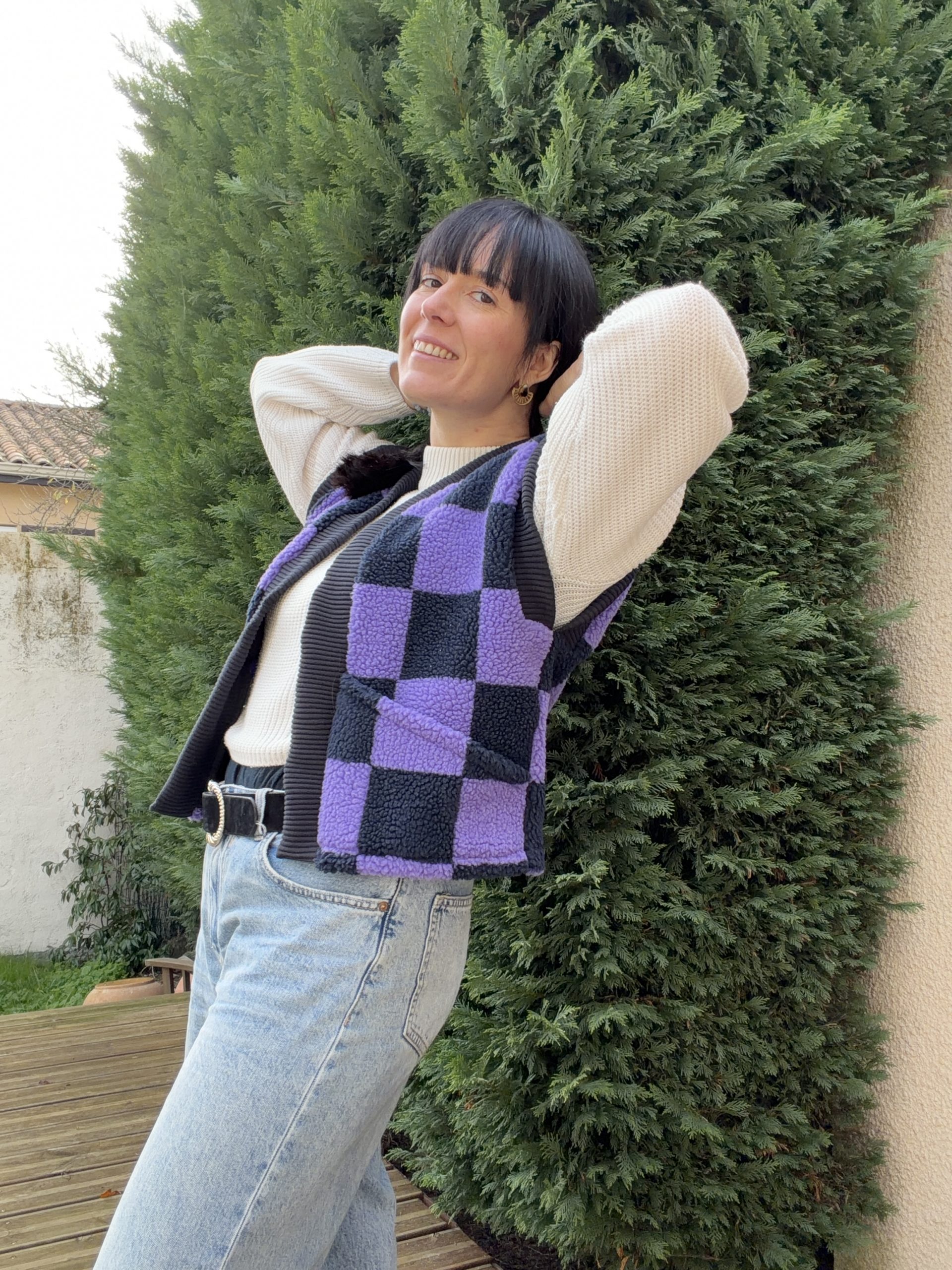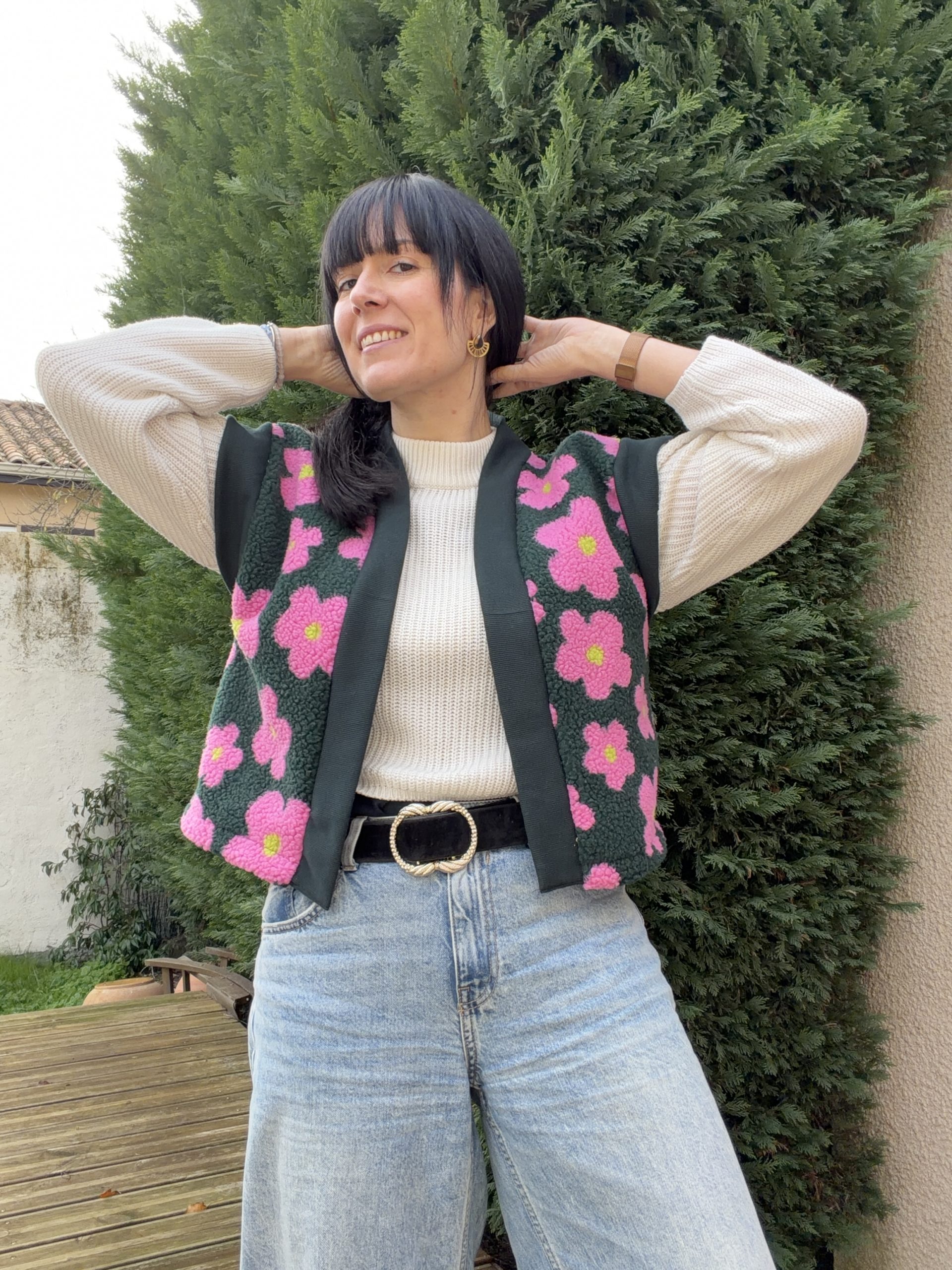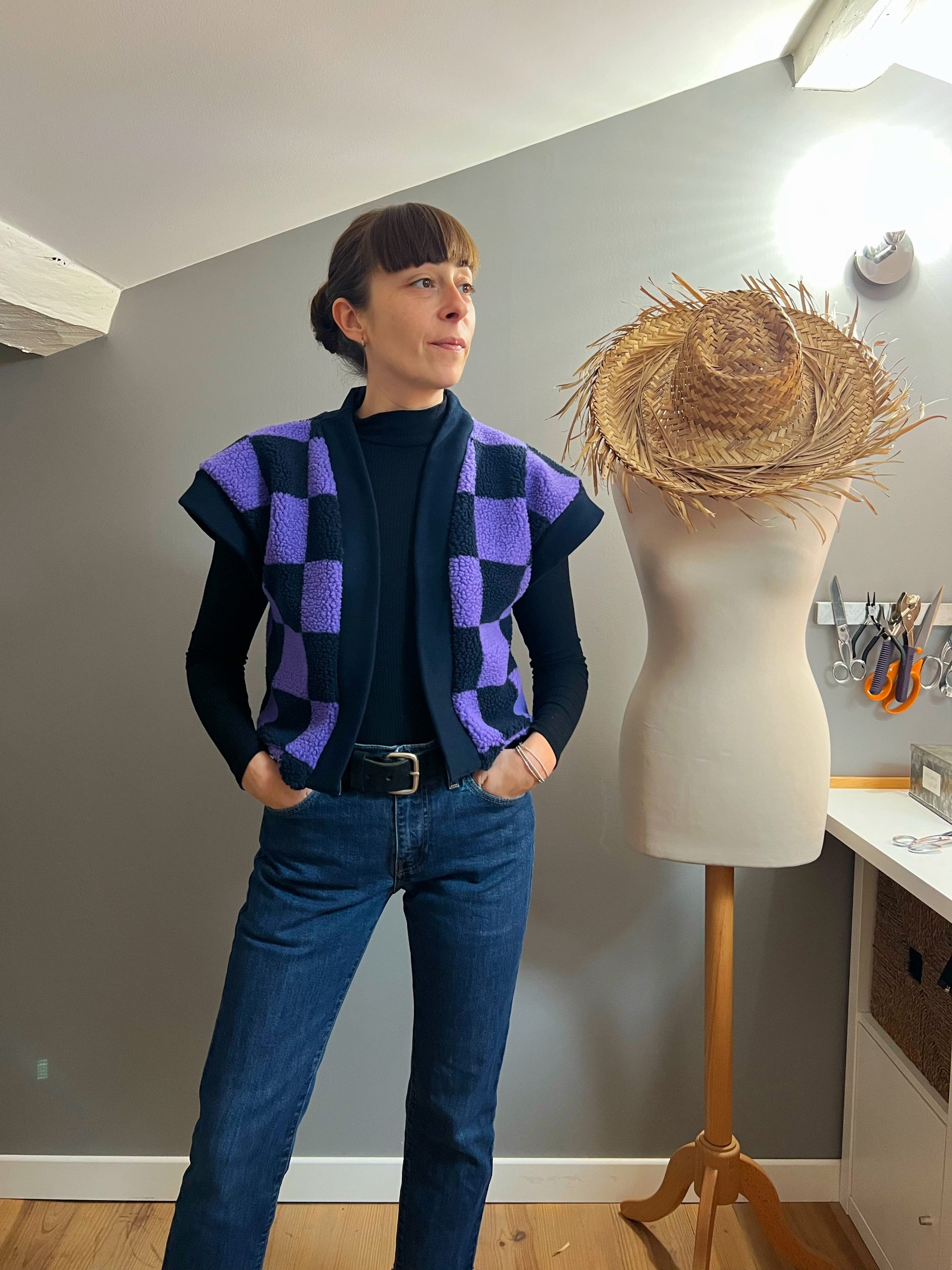 Le modèle présente une longueur au niveau des hanches, avec une col en bord-côte contrastant sur le devant, des emmanchures larges pour un effet fluide (idéal à porter avec une blouse bohème comme le patron Debra) pour s’adapter en toute saison !